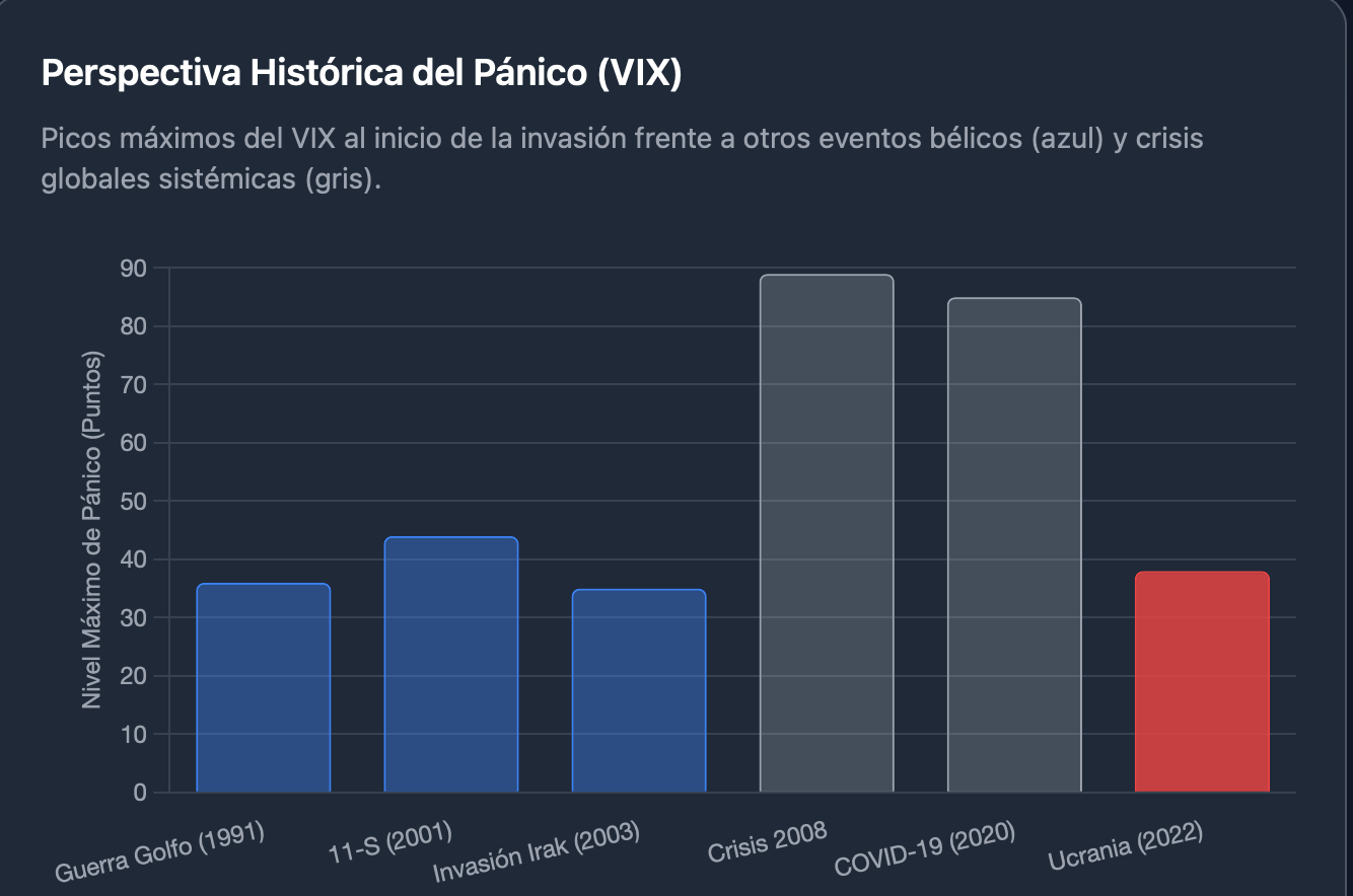 La guerra de Ucrania en 2022 llevó el VIX a la zona de 37 puntos. Es un nivel elevado, pero muy similar al de otros conflictos como la Guerra del Golfo (1991) o la invasión de Irak (2003), e incluso por debajo del pico tras el 11-S.