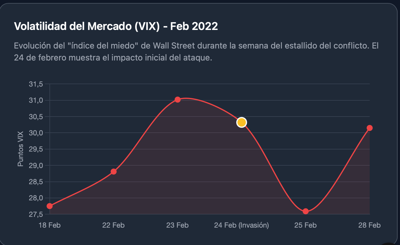 Cuando Rusia invade Ucrania en febrero de 2022, el VIX salta con fuerza. Pasa de la zona de 28 a casi 37 en cuestión de horas.
