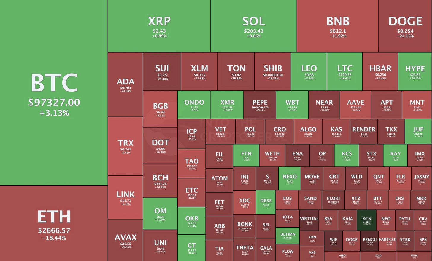 🔹A la baja: Varias criptos están en rojo con caídas importantes, como SUI (-34.28%), TON (-29.88%), ADA (-24.94%), DOT (-26.48%), y AVAX (-29.81%).