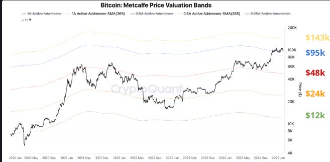 ✅ Bandas de Metcalfe estimadas: Bitcoin debería valer entre $48,000 y $95,000 según la actividad en cadena.
