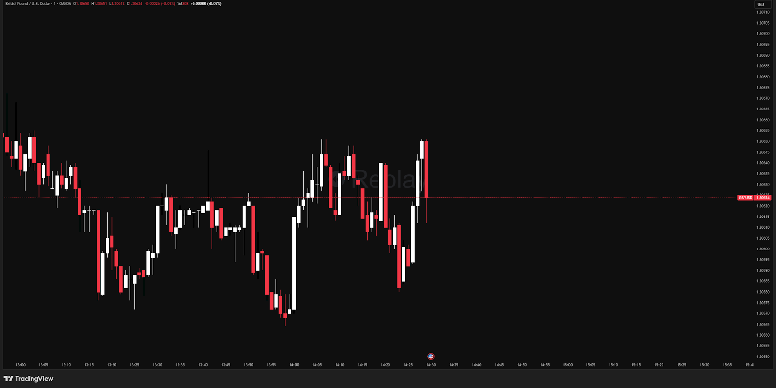 ¿Un ejemplo real? Lo podemos ver aquí. La vela en temporalidad de 1’ hoy en el par GBP/USD. Tiene una fuerte reacción a la baja