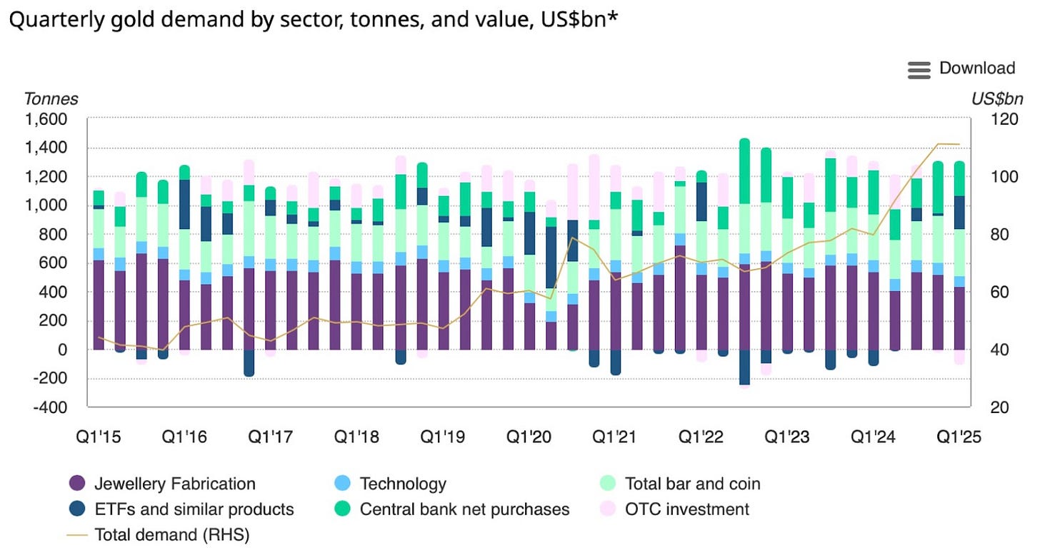 Los bancos centrales contribuyeron significativamente a esta fortaleza: continuaron comprando oro a un ritmo elevado en 2025, acumulando cientos de toneladas. Solo en el primer trimestre, las compras oficiales sumaron 244 toneladas —ligeramente por debajo del récord del trimestre anterior, pero aún dentro de los rangos más altos de los últimos años—. Este apetito persistente, liderado por economías emergentes que buscan diversificar sus reservas, proporcionó un suelo firme al mercado del oro.