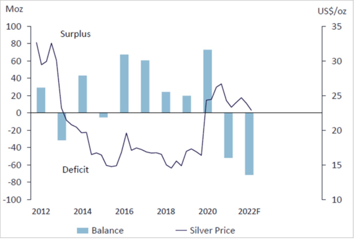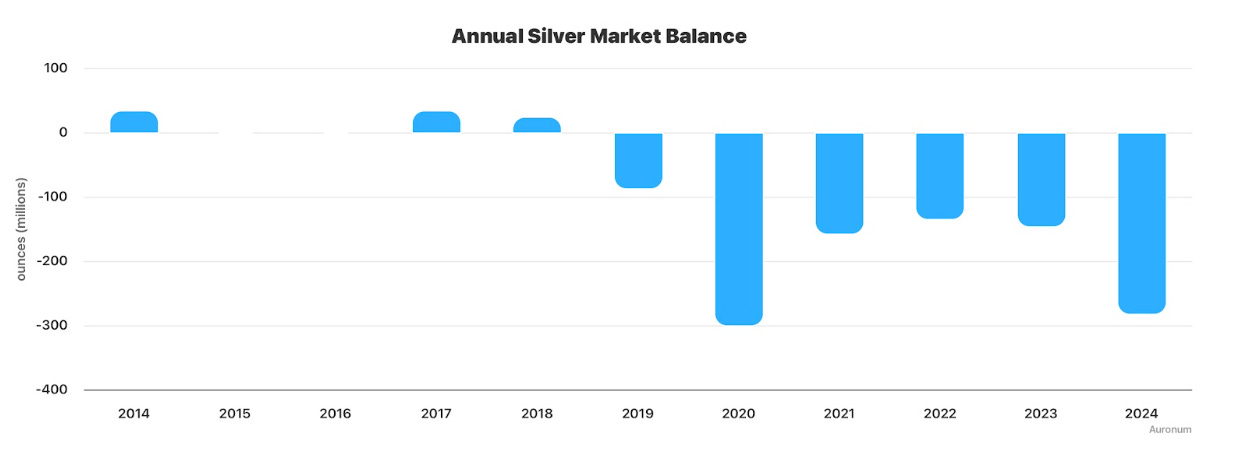Desde el lado fundamental, la plata enfrenta un déficit estructural que en 2025 se volvió imposible de ignorar. Por quinto año consecutivo, la demanda global superará la oferta mundial. El Silver Institute proyecta para 2025 un déficit de 117,6 millones de onzas, un respiro frente al récord del año anterior, pero aún un faltante considerable.