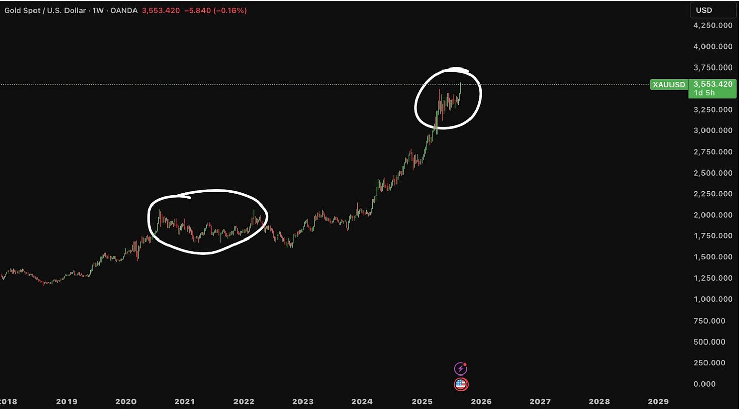 En el plano técnico, el oro está replicando un patrón muy similar al de 2022: tras un tramo alcista inicial, entró en una fase de acumulación horizontal que ha funcionado como zona de congestión y consolidación. En aquel entonces, el oro se mantuvo varias semanas en un rango estrecho antes de romper con fuerza al alza, activando un nuevo impulso que lo llevó a marcar máximos.