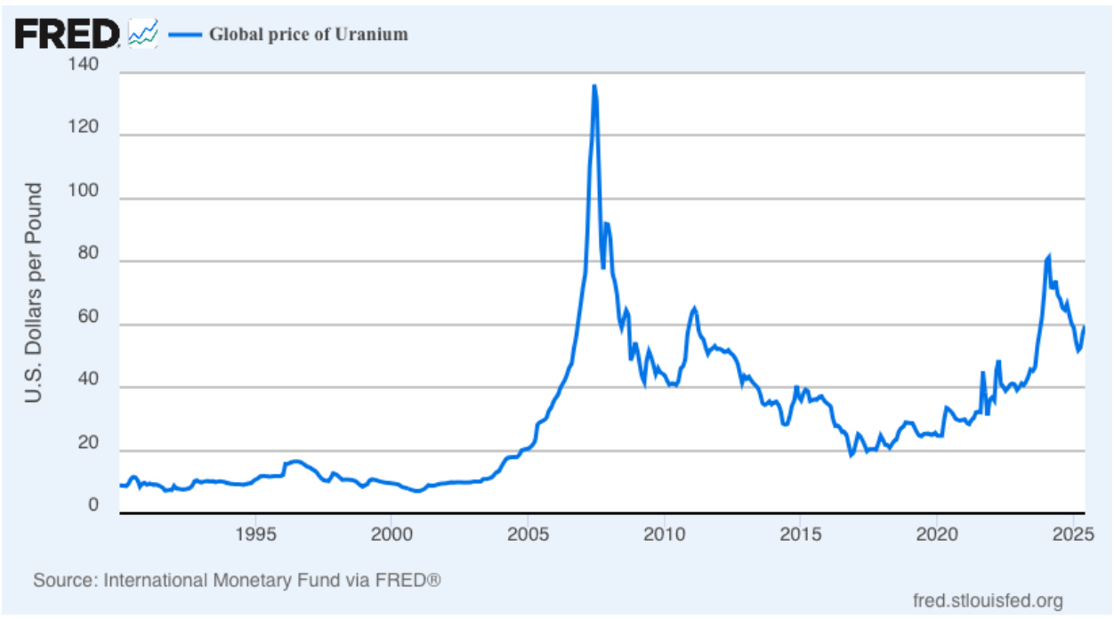 Aunque sigue por debajo del pico histórico de 2007 (~US$140), el repunte actual contrasta fuertemente con la década pasada, cuando los precios llegaron a caer por debajo de US$20 en 2016, en pleno letargo post-Fukushima.
