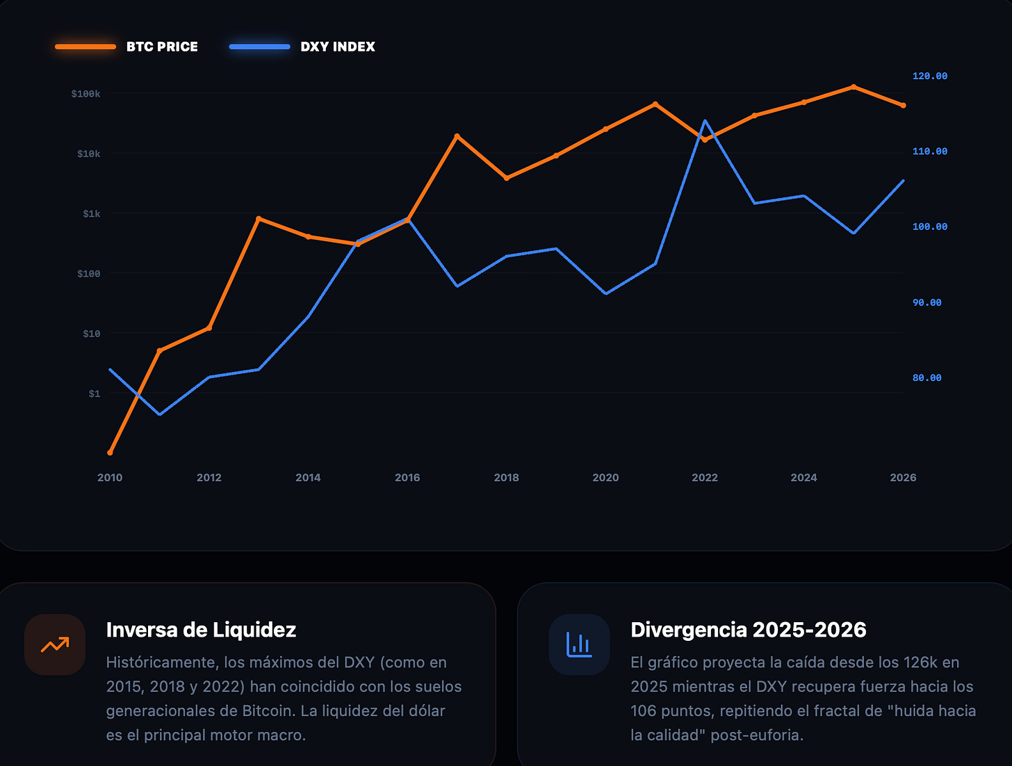 Históricamente, la debilidad del DXY ha coincidido con fases expansivas del precio de Bitcoin. Sin embargo, enero de 2026 ha mostrado una dinámica distinta: Bitcoin ha caído con fuerza incluso en un entorno de dólar debilitado.
