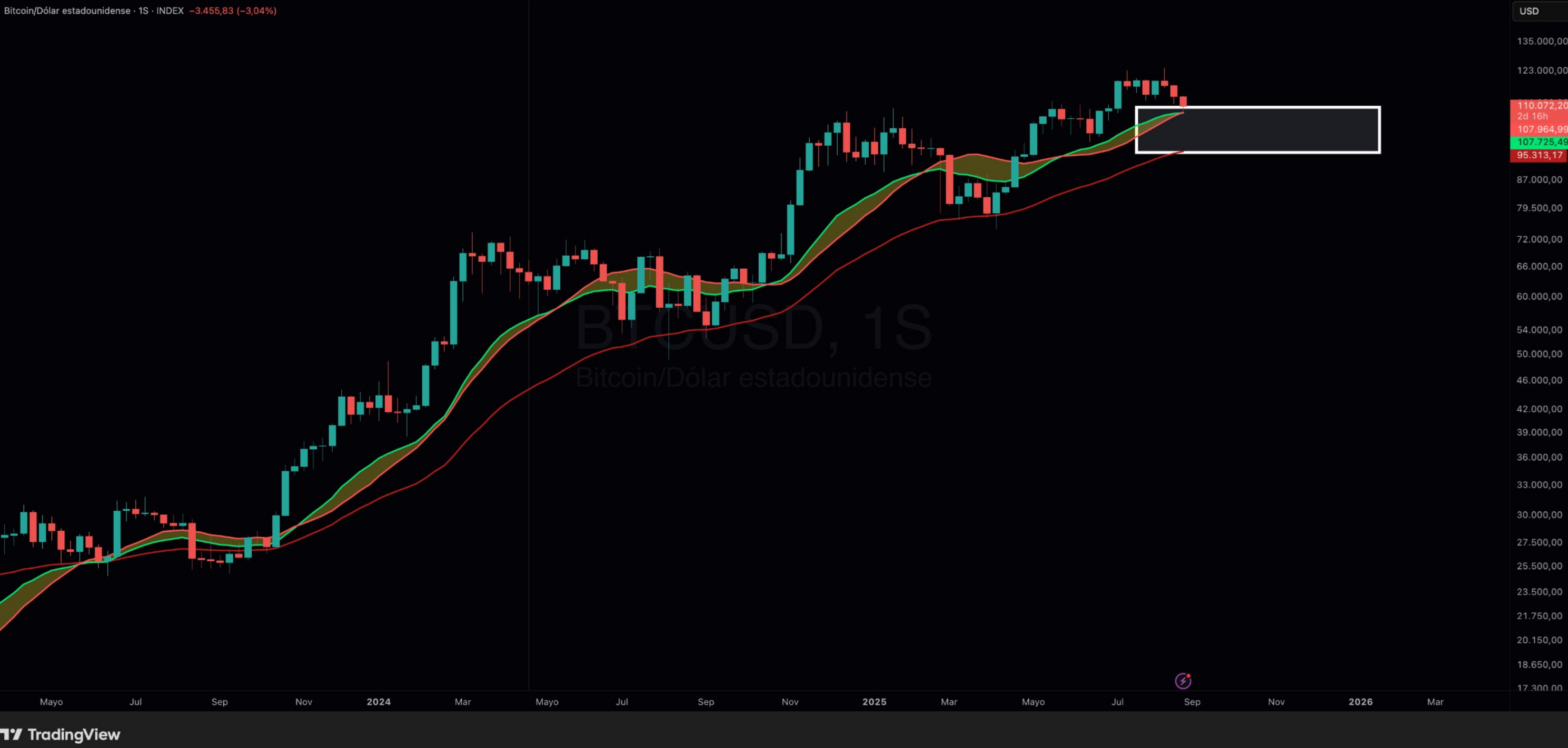 Bitcoin probablemente corrija por debajo de los $110,000, en una formación de cuña, y se mantenga entre la BMSB y la EMA50 semanal.