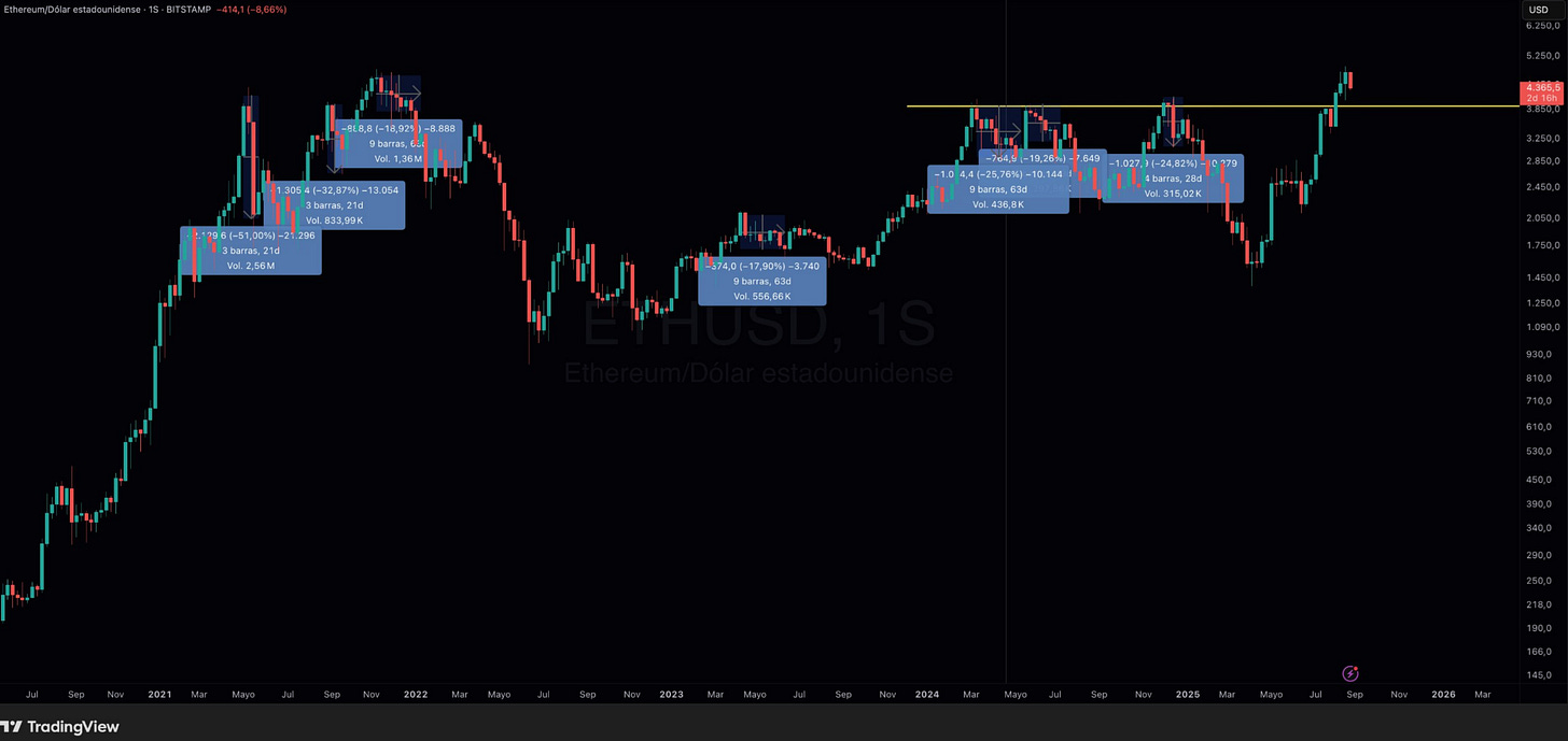En el caso de Ethereum, independientemente de si lo hace desde los niveles actuales o desde el objetivo que marcamos hace semanas ($6,000), es probable que forme una caída cercana al 30%. Es un patrón habitual cuando intenta romper por encima de máximos previos.