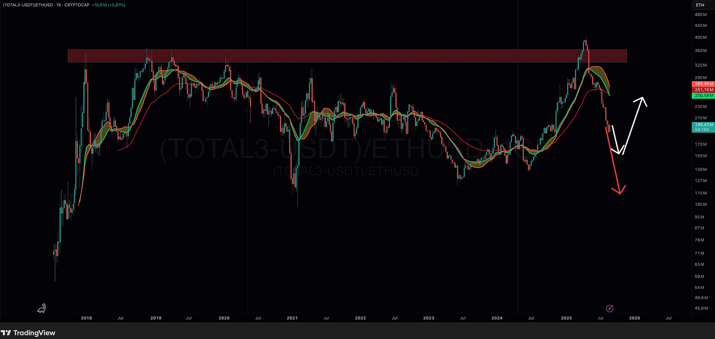 En Ethereum, a corto plazo cabe esperar un nuevo impulso bajista, que debería dar paso a un giro alcista si realmente se produce una rotación hacia la “altseason”. Si esto no sucede, el ciclo podría limitarse a una “bitcoinseason” y “ethereumseason”.