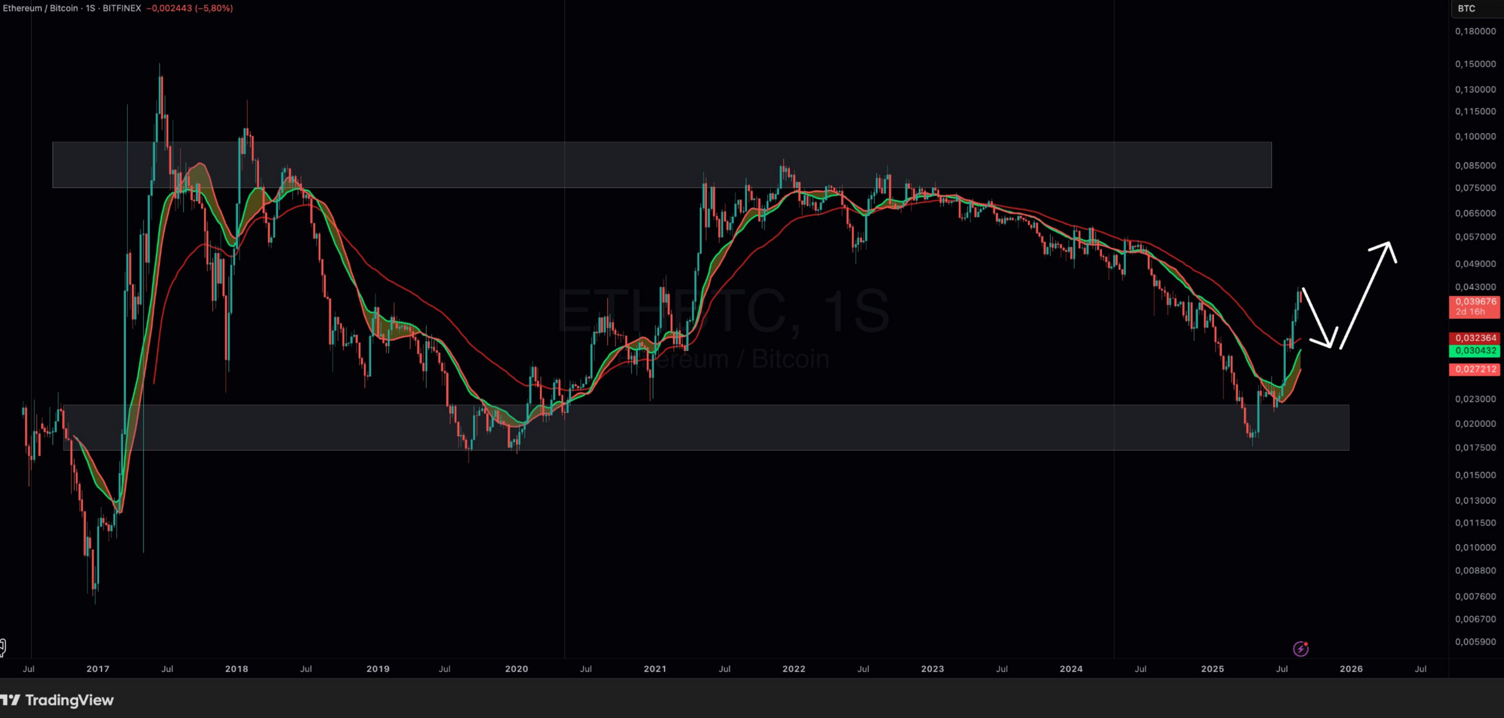 Respecto al par ETH/BTC, aunque ya cambió de tendencia, necesita un pullback por la fuerte sobrecompra, lo que podría generar un movimiento bajista a corto plazo. Este retroceso sería solo una corrección dentro de la tendencia alcista principal.