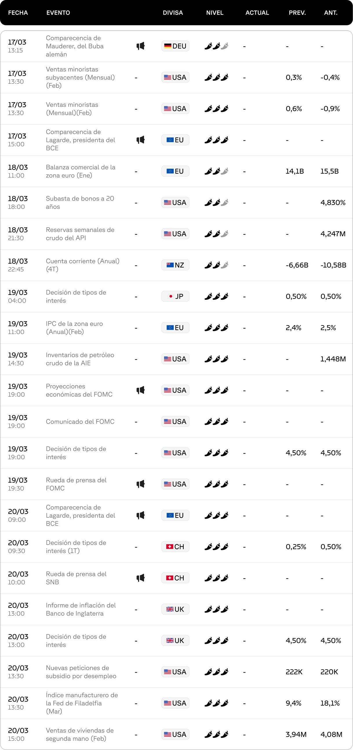 Hoy, lunes 17 de marzo, tienes acceso al calendario económico completo, donde encontrarás fechas clave, eventos relevantes y movimientos de divisas, junto con previsiones y resultados previos para respaldar tus decisiones.