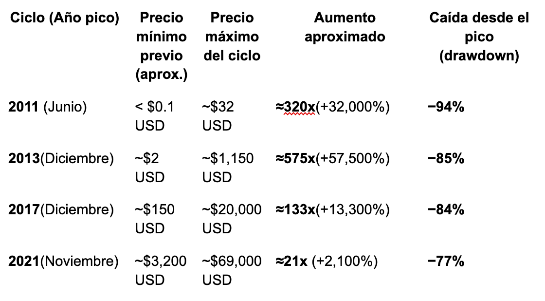 Identificamos cuatro grandes ciclos principales en la historia cripto, asociados aproximadamente a los años pico 2011, 2013, 2017 y 2021, respectivamente. En la siguiente tabla se resumen las métricas clave de cada ciclo, desde el mínimo del ciclo anterior hasta el máximo alcanzado, seguido de la caída en el mercado bajista subsiguiente: