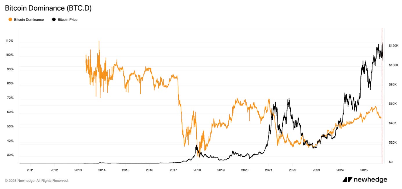 A octubre de 2025, la dominancia de BTC ronda el 60% —un nivel no visto desde 2017—, reflejando que, tras el enfriamiento del hype especulativo, los inversores han rotado significativamente de vuelta hacia Bitcoin.