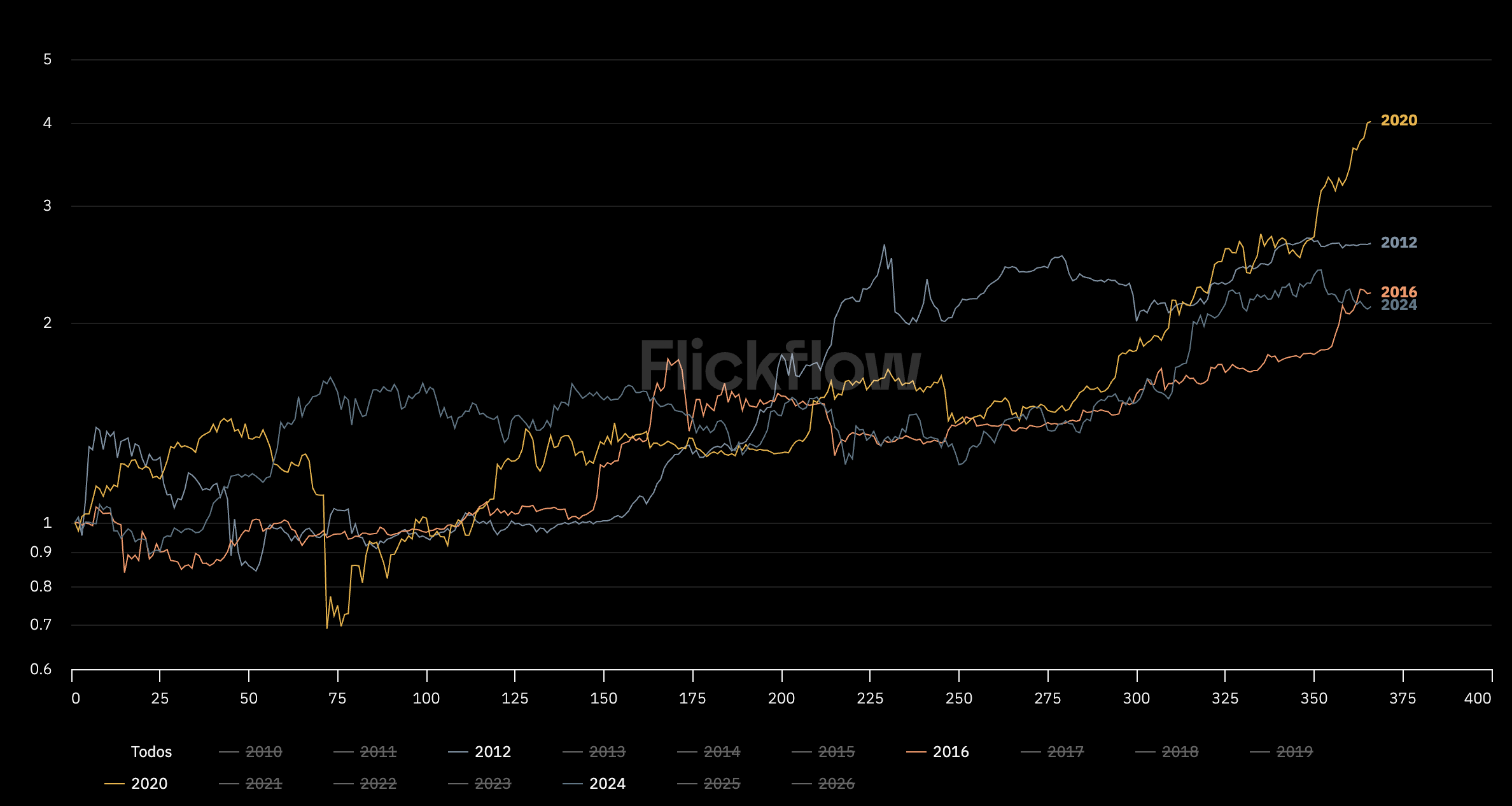 En Bitcoin, cada ciclo tarda aproximadamente 4 años — y esta directamente relacionado con el Halving. En concreto: 2012, 2016, 2020, 2024.