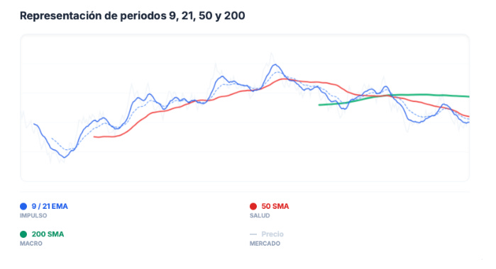 La EMA de 9 sirve para medir el impulso inmediato del mercado: mientras el precio se mantenga por encima, el movimiento suele ser fuerte y direccional.