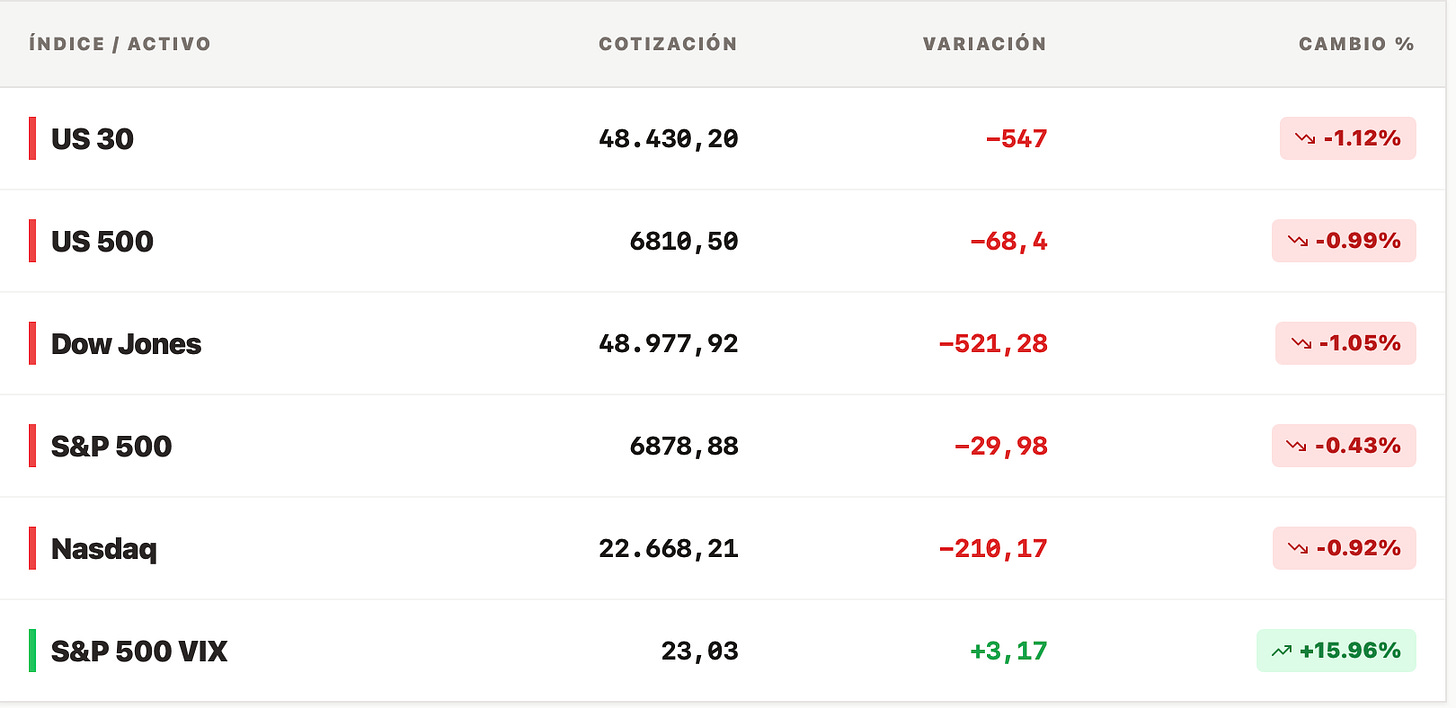 A esta hora, los futuros americanos están reaccionando con caídas moderadas, no con pánico. El S&P 500 y el Nasdaq descuentan presión inicial, pero lejos de un escenario de capitulación. Eso es importante.