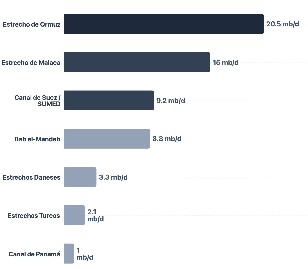 Para entender la magnitud de este cierre, basta con mirar los datos: por Ormuz transitan más de 20 millones de barriles diarios, muy por encima de cualquier otro cuello de botella energético del planeta.