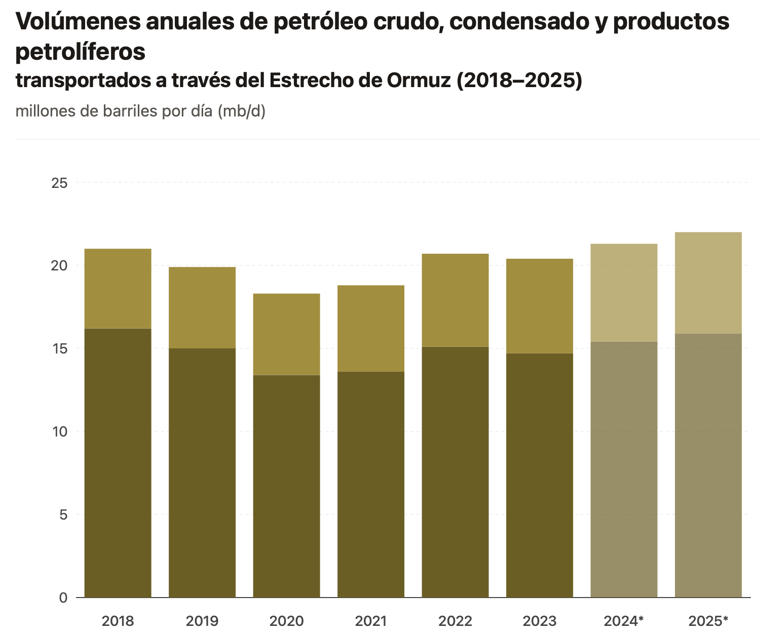 Para ofrecer una perspectiva, el siguiente gráfico representa el volumen de crudo transportado a través del Estrecho de Ormuz.