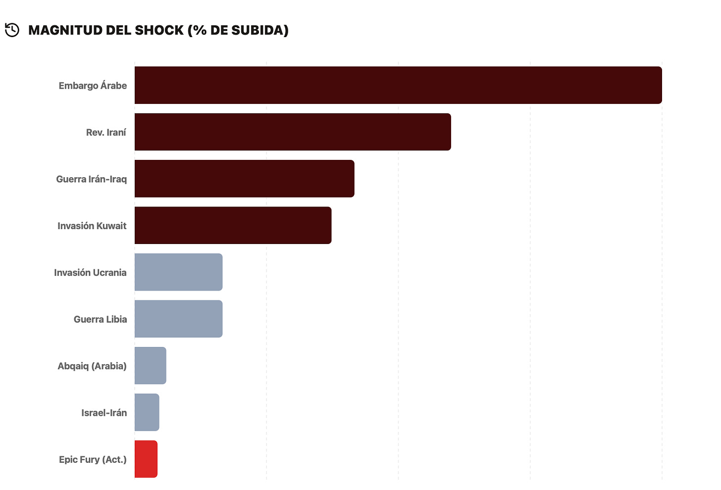 Es importante añadir un matiz clave cuando miramos este gráfico. Y es que, las magnitudes porcentuales más altas en episodios como el embargo árabe o la revolución iraní también reflejan que el punto de partida del petróleo era mucho más bajo en términos nominales.