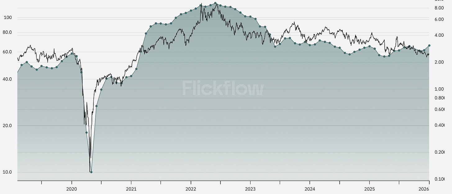 Si tenemos en cuenta petróleo vs. inflación, el gráfico deja una lectura interesante: en 2026 aparece una divergencia clara, con el petróleo estabilizándose o intentando girar al alza mientras la inflación sigue moderándose.