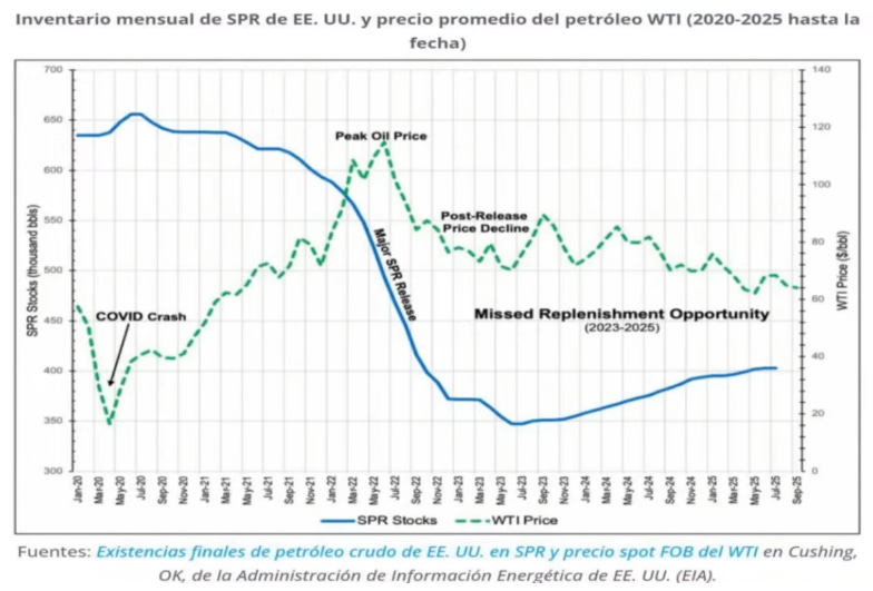 El estado actual de la Reserva Estratégica de Petróleo (SPR) de Estados Unidos añade un componente geopolítico adicional al mercado. Tras las fuertes liberaciones realizadas en 2022 para contener el aumento de precios de la gasolina —en medio de la crisis energética provocada por la invasión rusa a Ucrania— la SPR se redujo a su nivel más bajo en casi cuatro décadas, situándose alrededor de 390-400 millones de barriles. Este volumen es equivalente a apenas unas semanas de consumo estadounidense, lo que limita seriamente la capacidad de Washington para amortiguar un shock de oferta.
