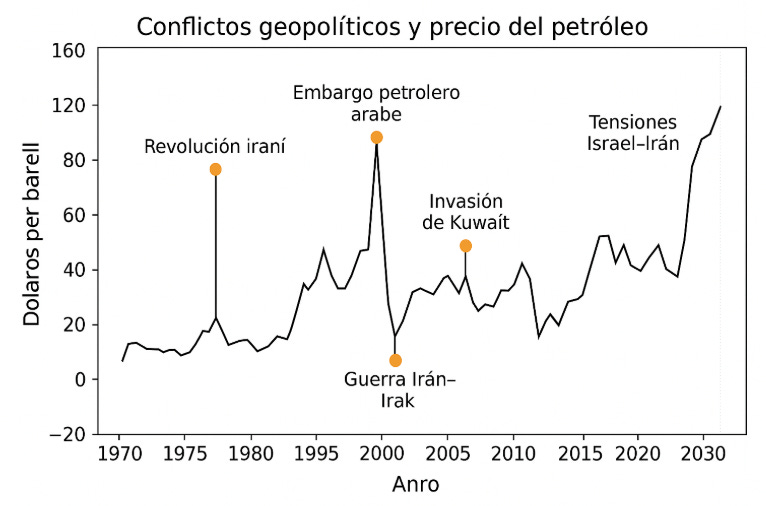 El precio del petróleo continúa reaccionando de manera especialmente sensible ante tensiones y conflictos geopolíticos. Históricamente, los eventos bélicos o las crisis en regiones productoras han provocado aumentos bruscos en las cotizaciones debido al temor a interrupciones en el suministro. Ejemplos emblemáticos incluyen el embargo petrolero árabe de 1973, que cuadruplicó los precios del crudo, y la revolución iraní de 1979, seguida por la guerra Irán-Irak, que duplicó nuevamente el valor del barril en muy poco tiempo. Algo similar ocurrió en 1990, cuando la invasión de Kuwait impulsó el precio desde aproximadamente 17 hasta cerca de 36 dólares en cuestión de meses, aunque posteriormente retrocedió con rapidez tras el desenlace de la guerra del Golfo.