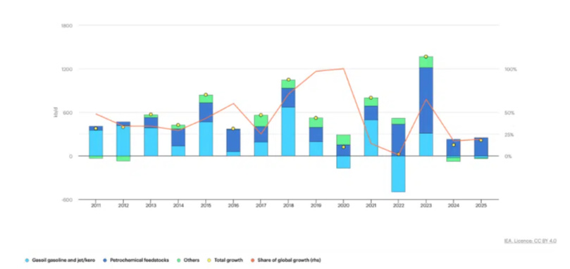 La economía china atraviesa un enfriamiento significativo que ha alterado su papel como motor principal de la demanda mundial de petróleo. Desde 2023, el consumo chino prácticamente se ha estancado debido a la debilidad industrial, la crisis del sector inmobiliario —que ha reducido la demanda de diésel por la menor actividad de construcción— y a cambios estructurales como la expansión de los vehículos eléctricos y los camiones a gas natural. Este cambio no es trivial: durante casi dos décadas, China explicó entre un tercio y la mitad del crecimiento global de la demanda de petróleo, por lo que cualquier desaceleración en su consumo tiene un impacto desproporcionado en el equilibrio internacional.