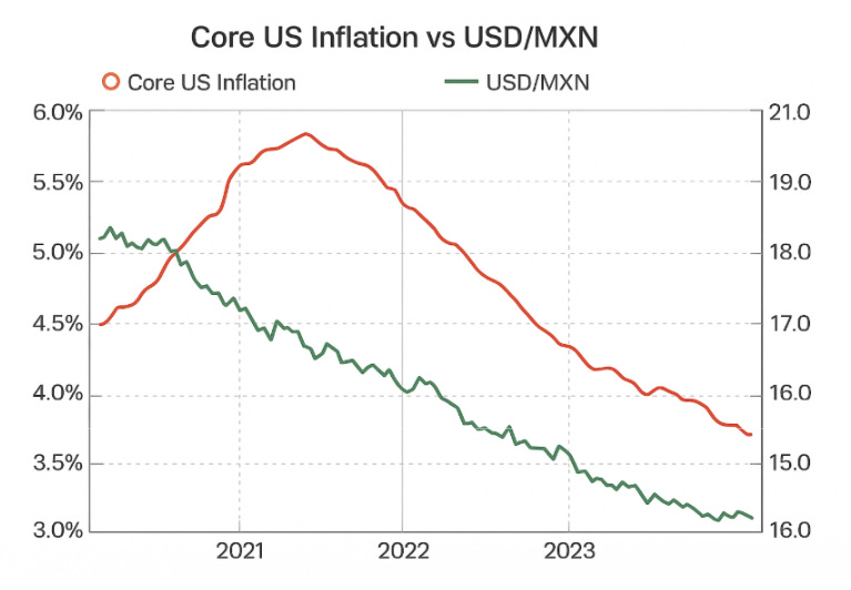 La razón por la que la inflación subyacente de Estados Unidos afecta tanto al peso mexicano (MXN) se resume en una cadena muy directa: inflación → decisiones de la Fed → dólar → flujos hacia emergentes → MXN.