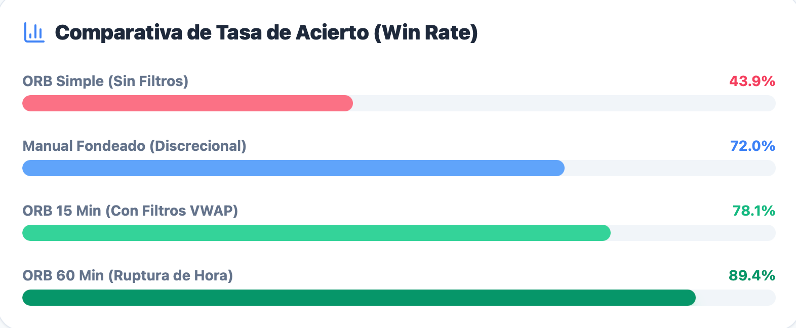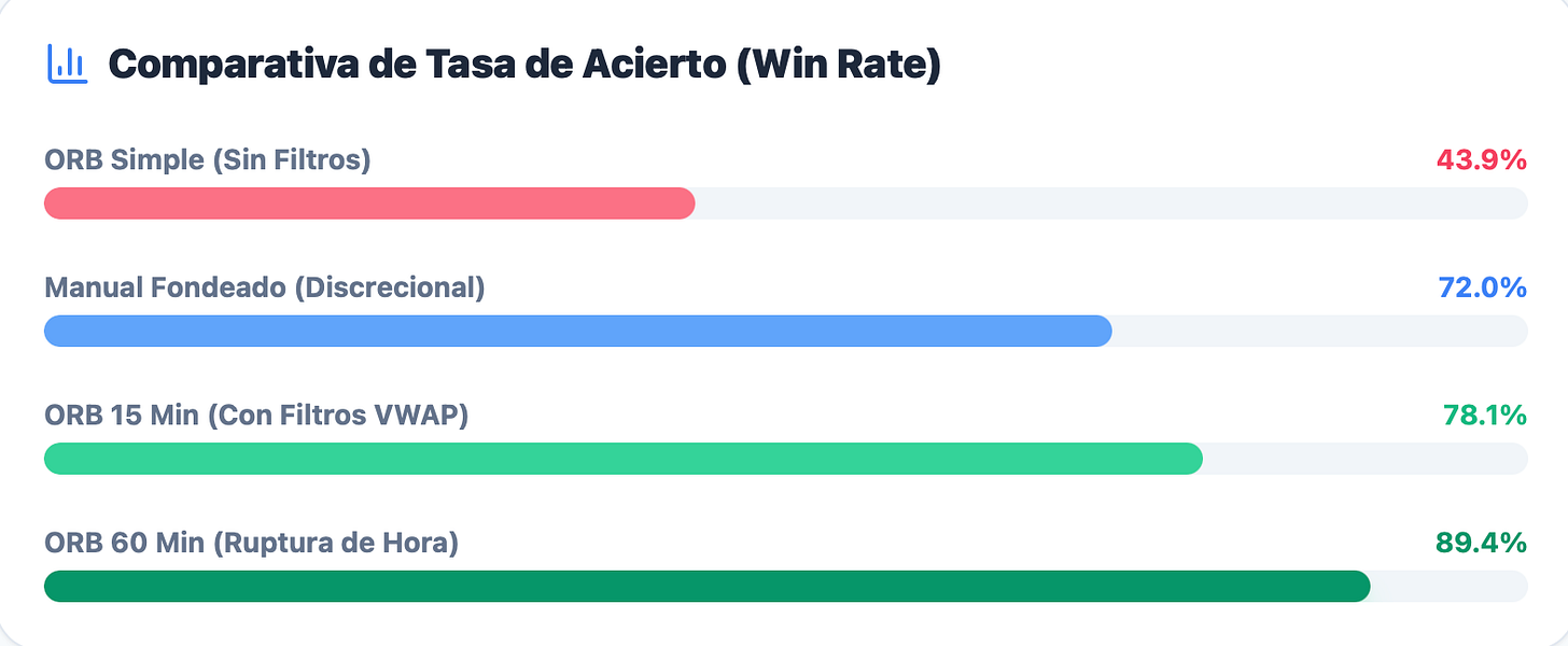 Por ejemplo, estudios sobre el ETF del Nasdaq (QQQ) muestran que un ORB simple apenas tiene una tasa de acierto del 43.9% y un margen de beneficio del -1.1%.