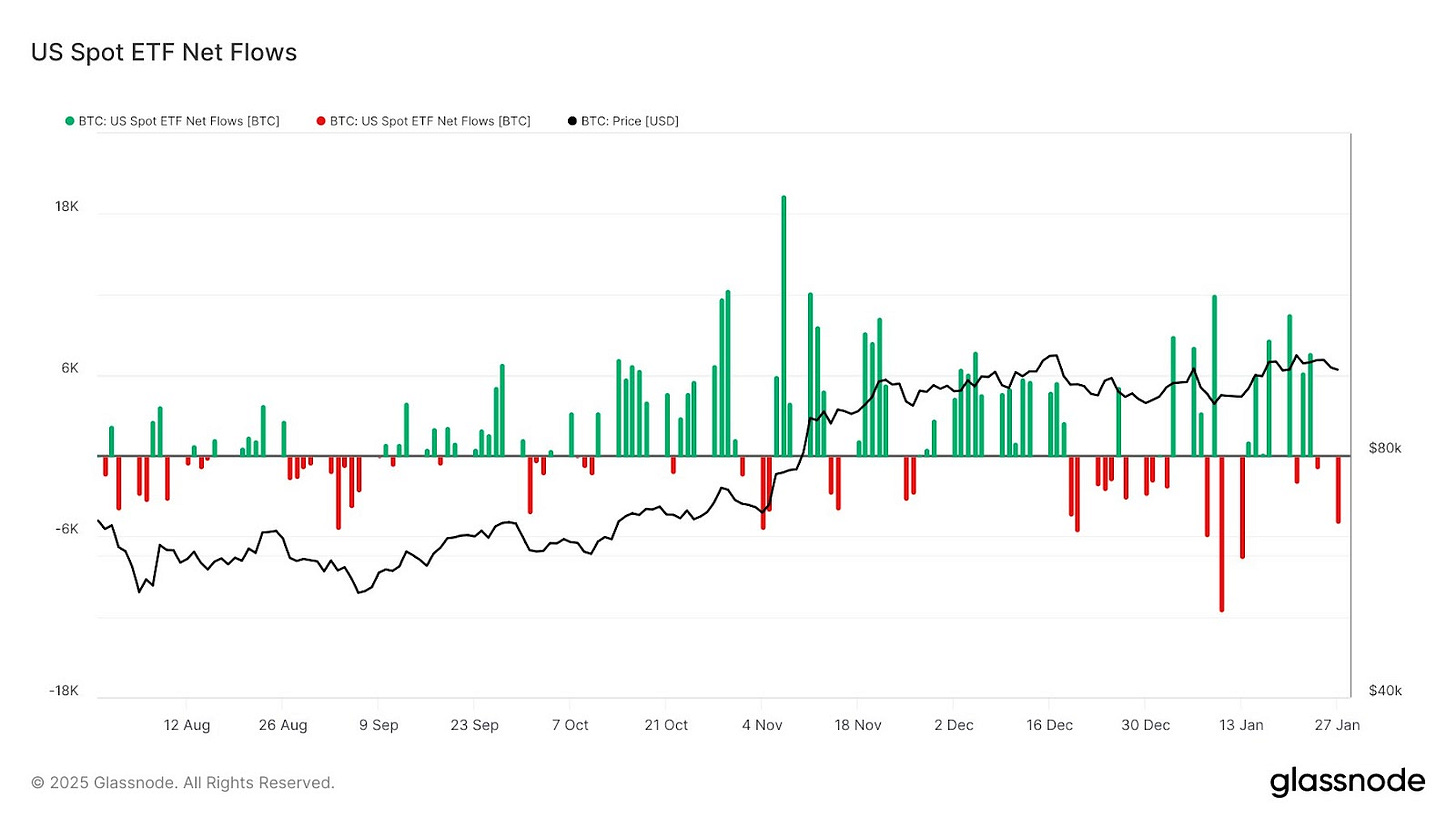 Descripción: Este gráfico muestra el volumen de compras y ventas diarias en los principales ETF de Bitcoin, indicando las diferencias de balance entre días consecutivos. Un volumen de $500M en ventas recientemente llevó el precio de Bitcoin por debajo de los $100K.