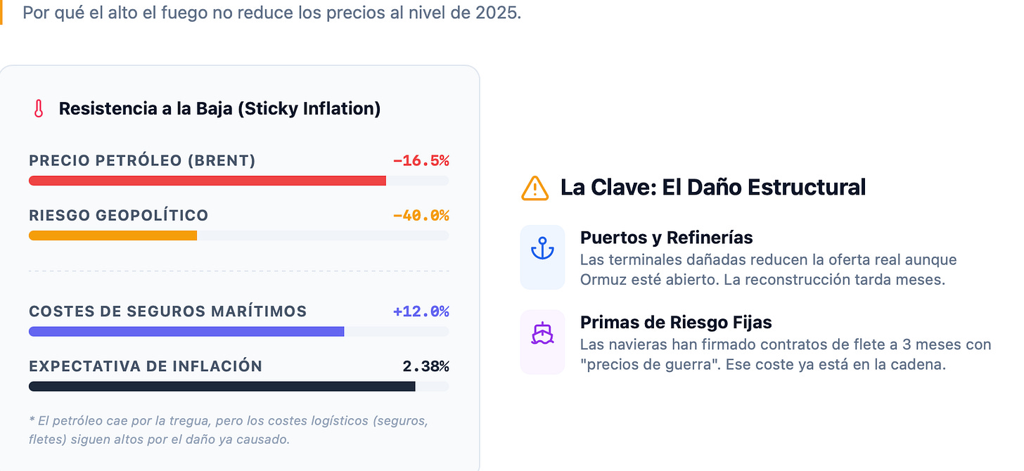 Aunque el alto el fuego elimina el riesgo inmediato, no revierte automáticamente los efectos acumulados de las últimas semanas.